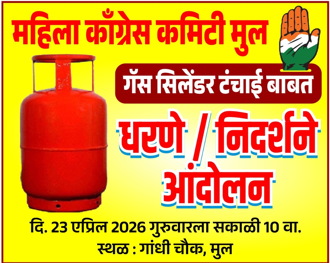 मुल शहरातील तथा तालुक्यातील समस्त जनतेला जाहीर आव्हान करण्यात येत आहे की‚ मुल तालुक्यात एकही अधिकृत गॅस एजंसी नसल्यामुळे सद्या सुरु असलेला गॅस सिलेंडर तुटवडा‚ गॅस पुरवठ्याच्या तांत्रीक अडचनीमुळे नागरीकांना होत असलेला नाहक त्रास या विरोधात‚ प्रदेश काँग्रेस कमिटीचे सरचिटणीस *माननीय संतोषसिंह रावत* तसेच मुल शहराच्या प्रथम नागरिक नगराधक्ष *मान.सौ एकता ताई समर्थ* यांच्या नेतृत्वात गुरुवार *दिनांक २३ एप्रील २०२६* ला सकाळी *१०-००* वाजता महिला काॅंग्रेस मूल तर्फे *गांधी चौक* मूल येथे धरणे/निदर्शने आंदोलन करण्यात येत आहे. तरी मुल शहरातील व तालुक्याकील समस्त जनतेने आपल्या न्याय हक्कासाठी, सुस्त प्रशासनाला जागे करण्यासाठी उपस्थित रहावे असे आवाहन मुल तालुका काॅग्रेस कमेटी‚ नगर परिषद अध्यक्ष, उपाध्यक्ष, सभापती,नगर सेवक,बाजार समिती पदाधिकारी, यांनी केले आहे.